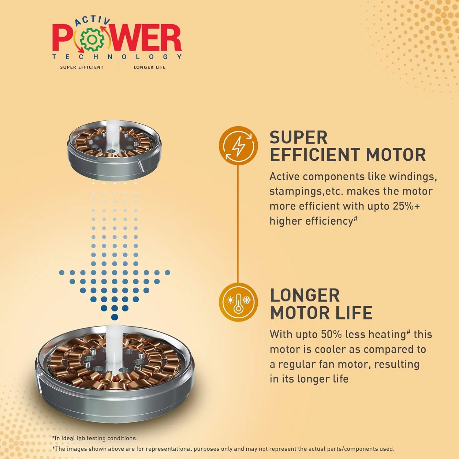 Enter the world of efficiency and style with the Crompton High-Speed Toro 1 Star – a fan that's not just cool but also smart. It promises energy savings without compromising on performance. The stylish finish and anti-rust aluminum body add a modern touch to your space. Powered by Active Power Technology, this fan is not just about cooling, it's a cool upgrade. Make every rotation count. Opt for the Crompton High-Speed Toro 1 Star – a better way to keep calm in every situation.